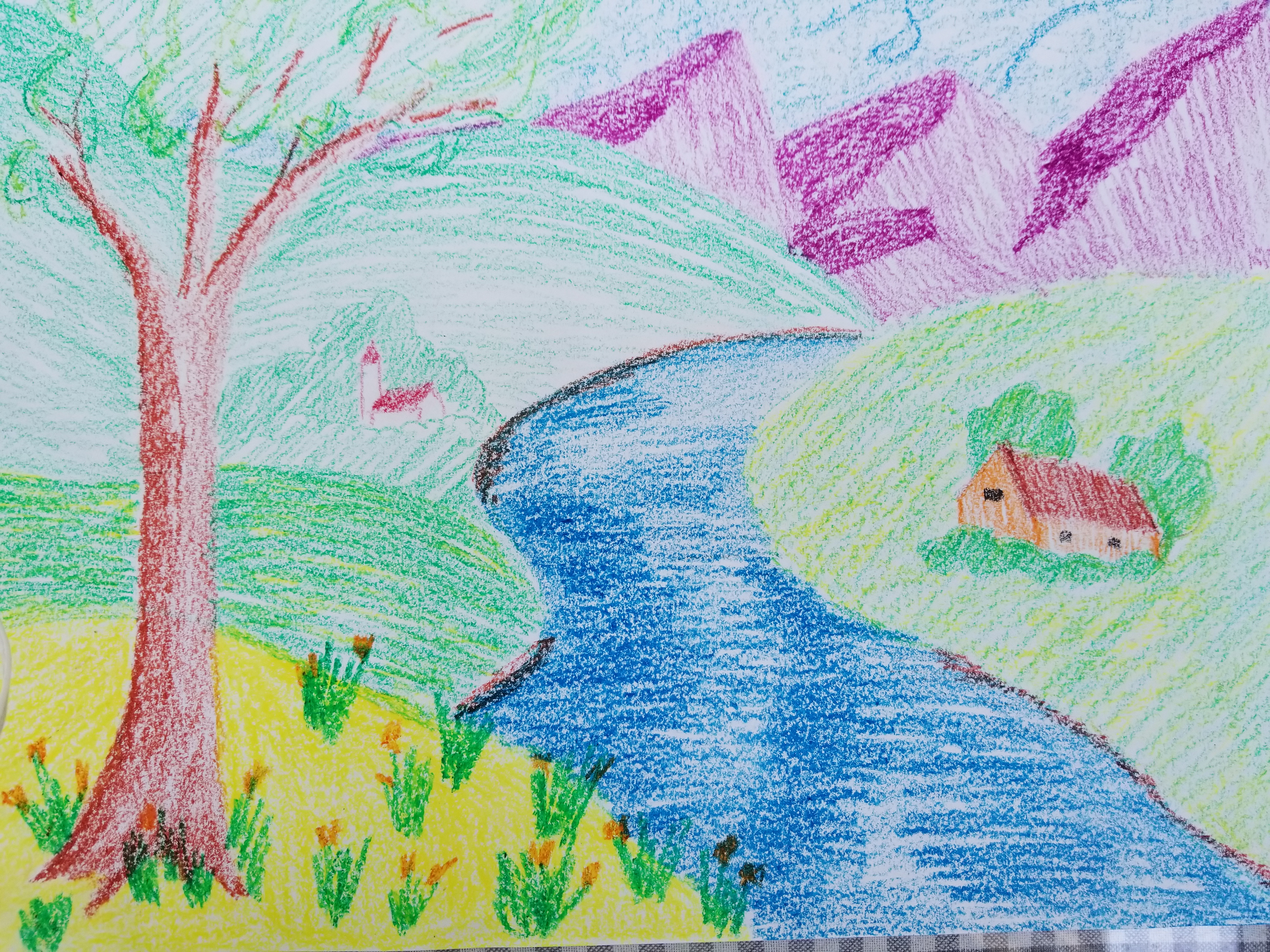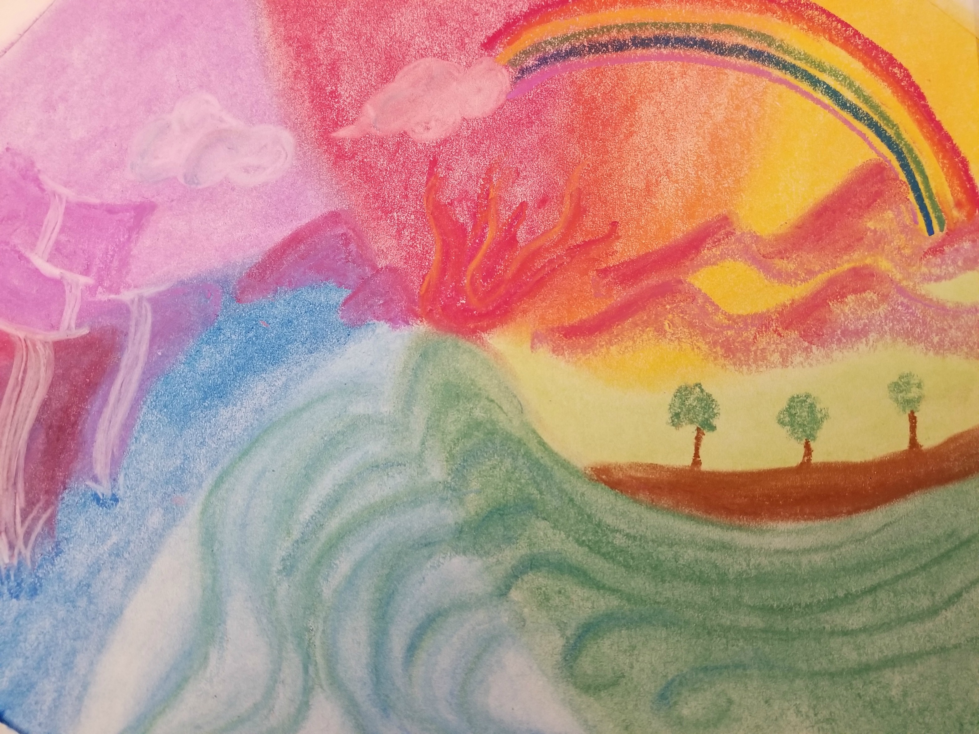 I had an opportunity to do four lessons from last year’s Weekly Art, now available as Bundle #2. This bundle includes a crayon drawing landscape, veil painting, a chalk drawing, and a pencil drawing. I’d never done veil painting before (because I didn’t know how! Yes, it’s true). And the chalk drawing on paper was my favorite!